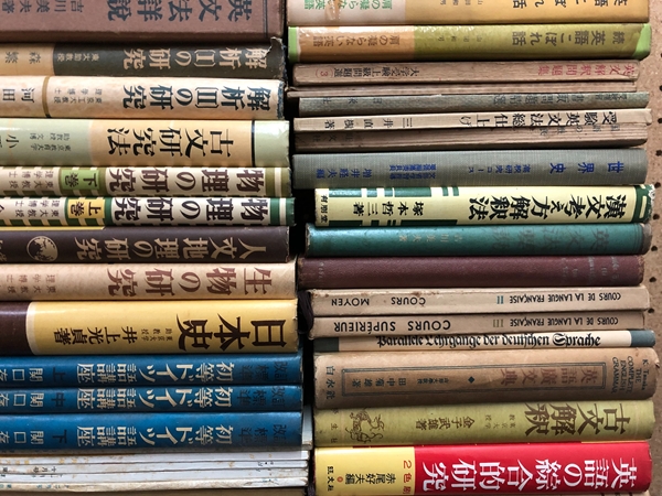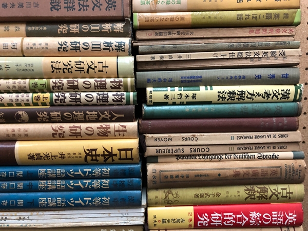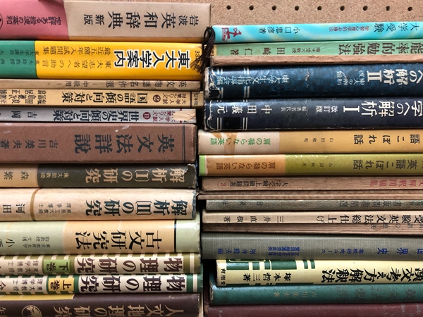 このたび、京都府京都市にお住まいのお客様より、1970年代に出版された英文法・英文解釈などの古い参考書をまとめて宅配買取させていただきました。旺文社、研究社などの名著が中心で、書き込みのあるものも含めて、約100冊をお譲りいただきました。